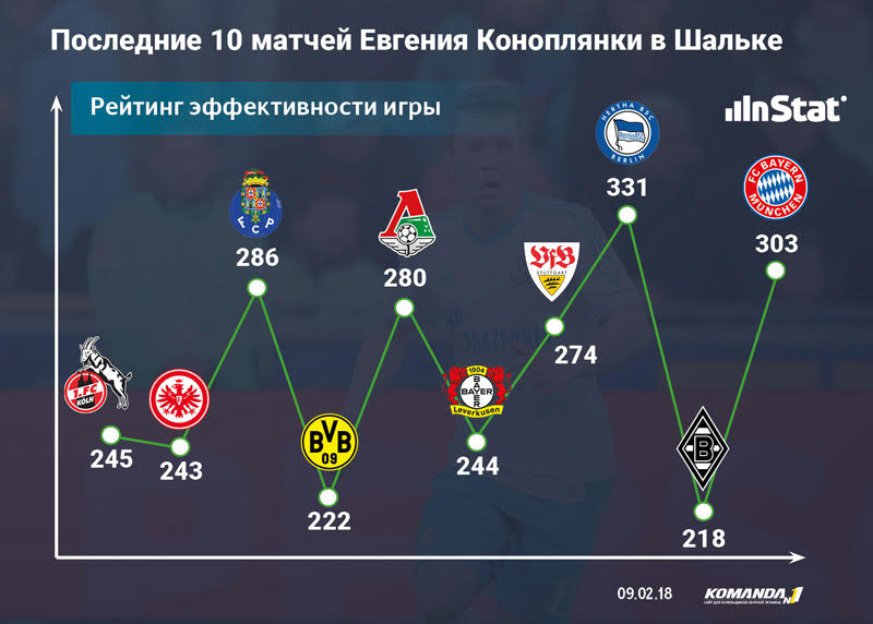 Полузащитник сборной Украины Евгений Коноплянка продолжает свои нестабильные выступления в Шальке, и на этот раз, после провального поединка с Боруссией М, он показал хорошую игру в гостевой встрече с другим лидером чемпионата — Баварией. По оценке эффективности игры, рейтингу InStat Index, украинец стал самым полезным исполнителем своего коллектива (303 балла).