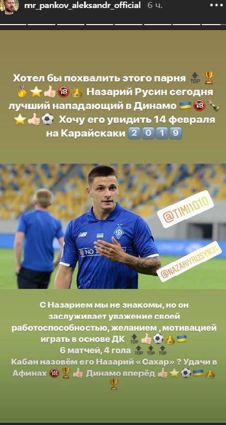 Футбольный менеджер Александр Панков в своем Instagram похвалил нападающего "Динамо" Назария Русина.