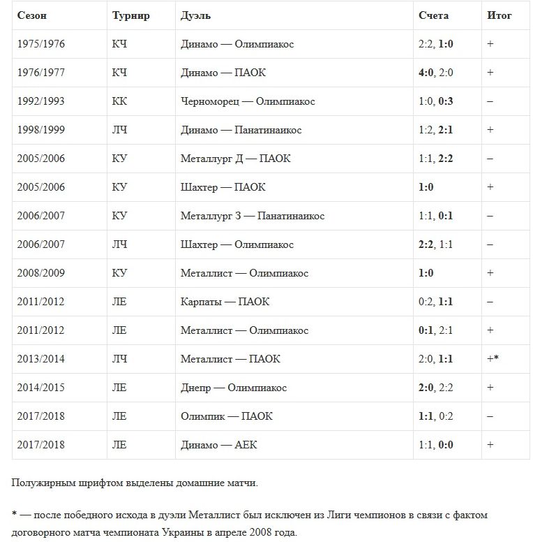 У Динамо с греческими клубами статистика просто идеальная — 100% успеха в двухматчевых противостояниях. Правда, в 1970-е годы киевляне доказывали превосходство убедительнее — три победы и ничья в четырех матчах. А вот после этого была только одна победа в четырех встречах. Но дальше по турнирной сетке всегда проходили киевляне.