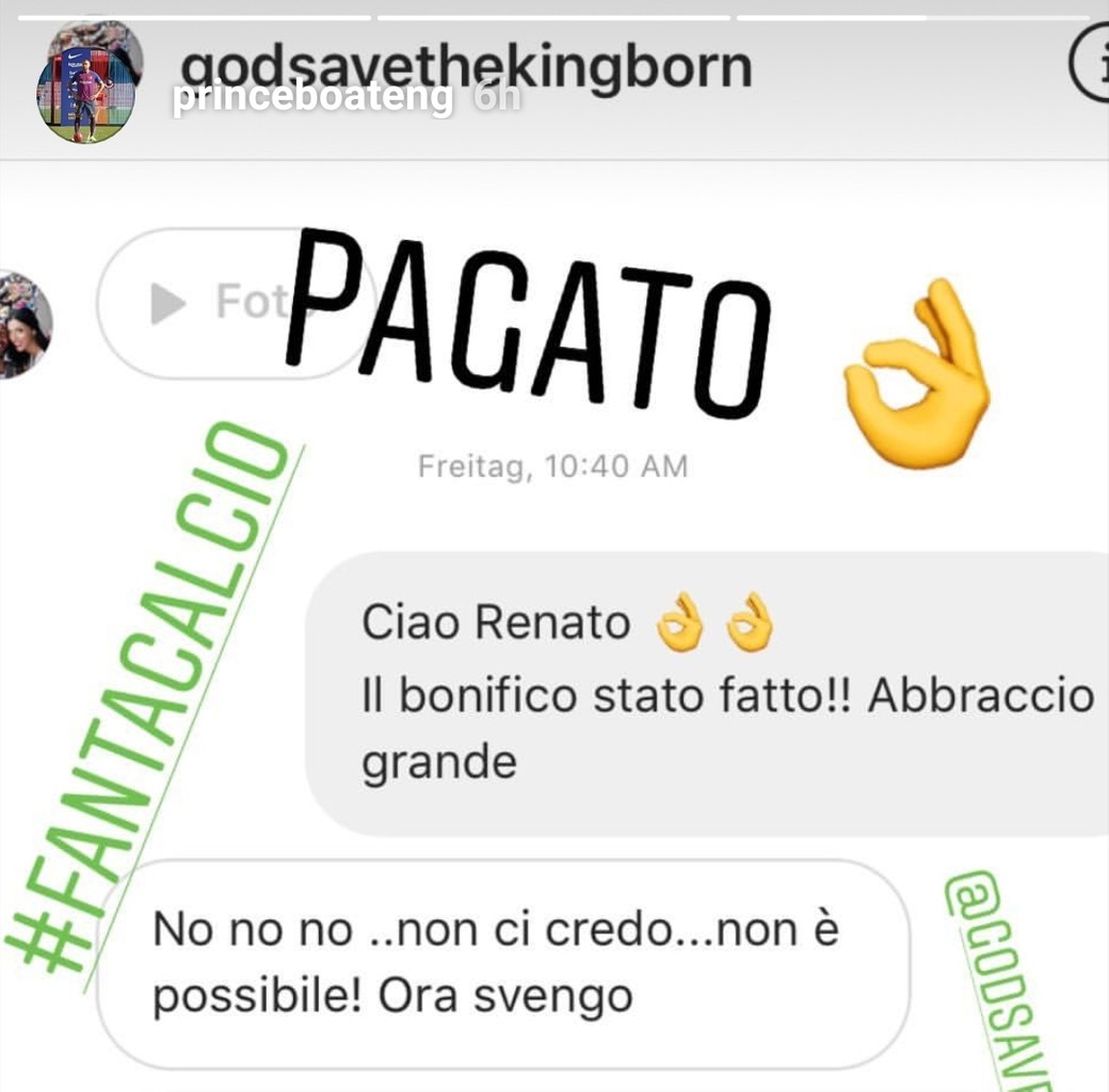 Одним из таких людей стал Ренато, который, скорее всего, ни на что не рассчитывал, но с досады написал Боатенгу сообщение с просьбой вернуть деньги, которые он потерял в связи с отъездом игрока в чемпионат Испании. Причем Ренато указал в своем сообщении номер банковского счета. Каково же было удивление болельщика, когда спустя несколько дней Боатенг возместил финансовые потери Ренато и заодно написал ему ответное сообщение: