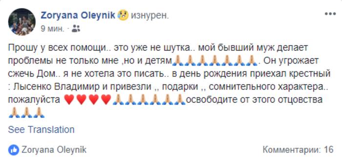 Бывшая жена экс-игрока сборной Украины Дениса Олейника Зоряна сообщила, что ее экс-супруг намерен поджечь ее дом.
