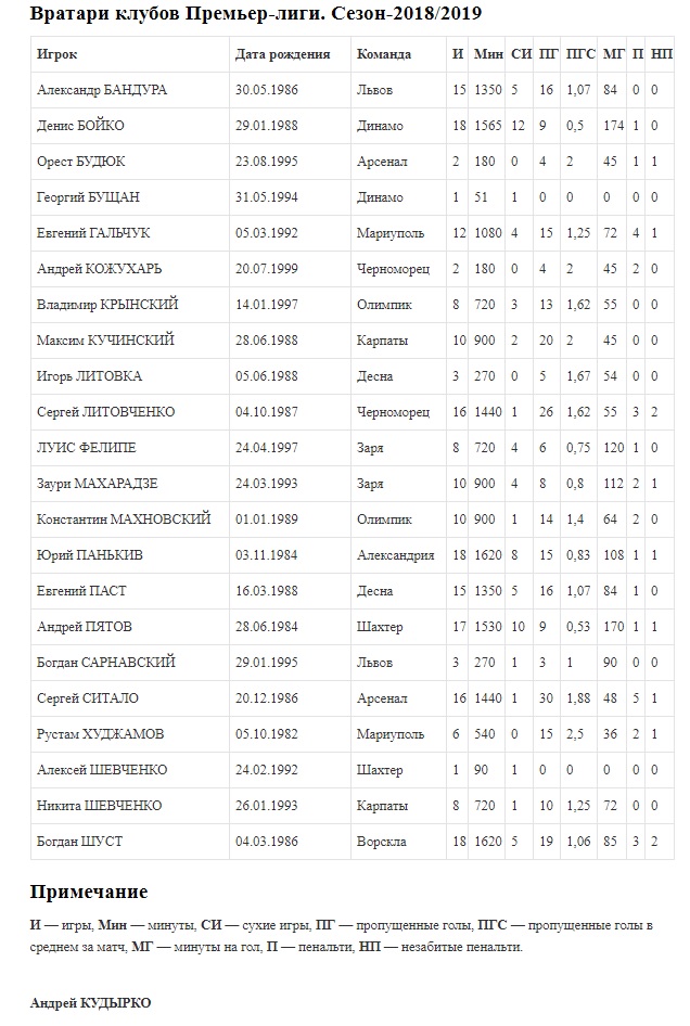 Эта пара, к слову, разделила 2—3 места рейтинга самых возрастных вратарей сезона. Возглавляет его Рустам Худжамов. А во главе рейтинга самых молодых стражей ворот — Андрей Кожухарь. Единственный в этом списке кандидат в молодежную сборную Украины нового образца.