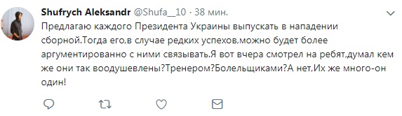 - Предлагаю каждого президента Украины выпускать в нападении сборной. Тогда его, в случае редких успехов, можно будет более аргументированно с ними связывать. Я вот вчера смотрел на ребят, думал кем же они так воодушевлены? Тренером? Болельщиками? А нет, их же много - он один! – написал Шуриф на своей странице в Твиттере.
