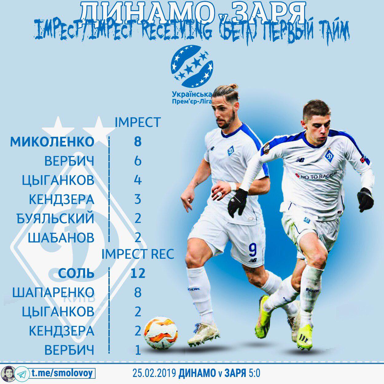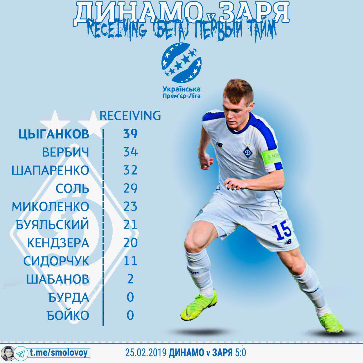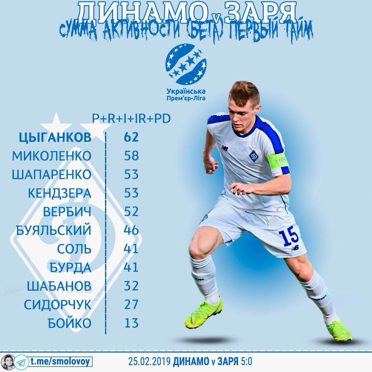 Цыганков - лучший игрок "Динамо" по степени активности в перемещении мяча, Миколенко 2-й, Шапаренко 3-й