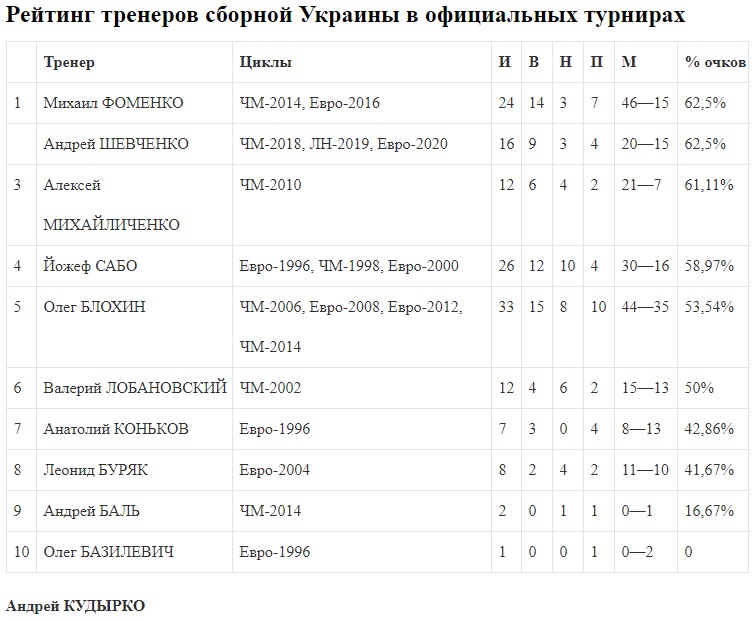К слову, стоит учитывать, что в этом рейтинге учтены игры и отборочных, и финальных турниров. В финалах, понятное дело, набирать очки было сложнее. На ЧМ-2006 Украина набрала 46,67% очков, а на Евро-2012 — 33,33%. Оба раза тренером был Блохин (в среднем у него по финальным турнирам — 41,67%). У Фоменко в финалах — 0%.