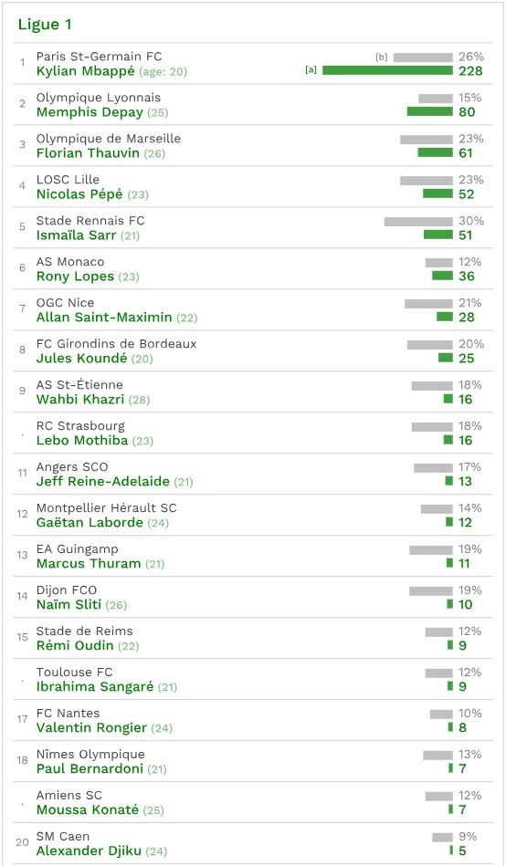 Самым дорогим игроком из всех пяти лиг оказался нападающий французского «ПСЖ» Килиан Мбаппе, чью стоимость оценили в 228 млн евро, что составляет 26% от общей суммы стоимости состава парижского клуба. В тройке самых дорогостоящих футболистов чемпионата Франции также нападающий «Лиона» Мемфис Депай — 80 млн евро (15%) — и вингер «Марселя» Флориан Товен — 61 млн евро (23%). Если говорить о процентном соотношении стоимости, то в чемпионате Франции играет и лидер среди топ-5 лиг Европы, вингер «Ренна» Исмаила Сарр; его цена — 51 млн евро, это практически треть (30%) от суммы стоимости состава клуба.