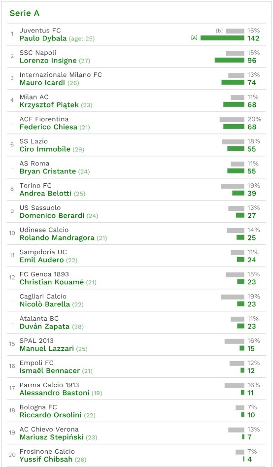 В чемпионате Италии (Серии А) самым дорогим игроком оказался нападающий «Ювентуса» Пауло Дибала — 142 млн евро (15%). Второй в списке — нападающий «Наполи» Лоренцо Инсинье, его стоимость — 96 млн евро (15%); замкнул тройку форвард «Интера» Мауро Икарди — 74 млн евро (13%).