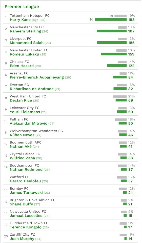 В английской Премьер-лиге первая тройка выглядит следующим образом: Харри Кейн («Тоттенхэм») — 198 млн евро (19%), Рахим Стерлинг («Манчестер Сити») — 187 млн евро (13%), и Мохамед Салах («Ливерпуль») — 185 млн евро (13%). Все они являются нападающими.
