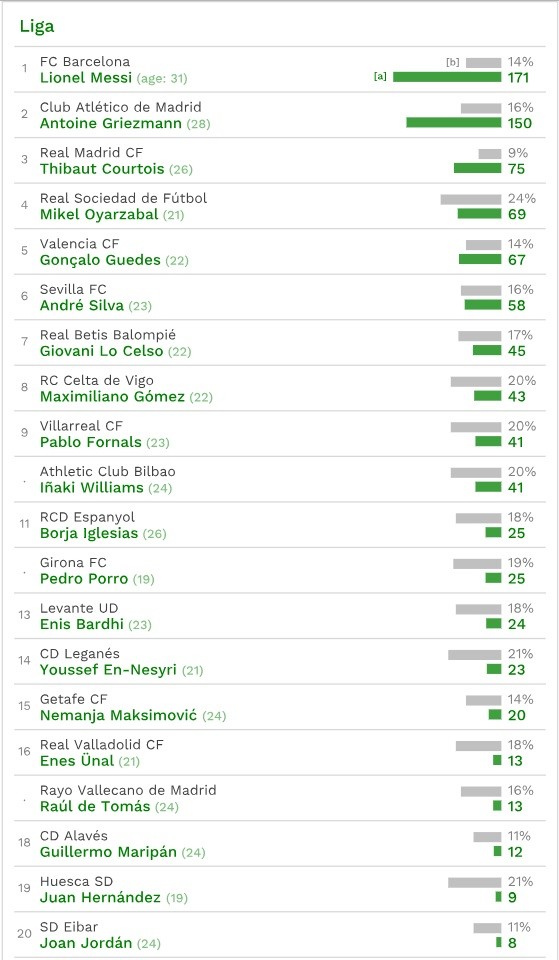 В испанской Ла Лиге самый дорогой футболист — нападающий «Барселоны» Лионель Месси, его стоимость — 171 млн евро (14%). На втором месте в списке расположился нападающий «Атлетико» Антуан Гризманн — 150 млн евро (16%). Третьим оказался вратарь «Реала» Тибо Куртуа — 75 млн евро (9%).