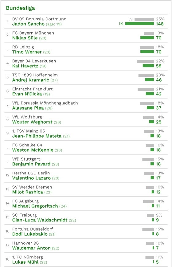 В немецкой Бундеслиге самым ценным активом среди футболистов является вингер дортмундской «Боруссии» Джейдон Санчо — 148 млн евро (25%). Второй в списке — защитник «Баварии» Никлас Зюле, он стоит 70 млн евро (13%); третий — форвард «РБ Лейпциг» Тимо Вернер, 70 млн евро (18%).