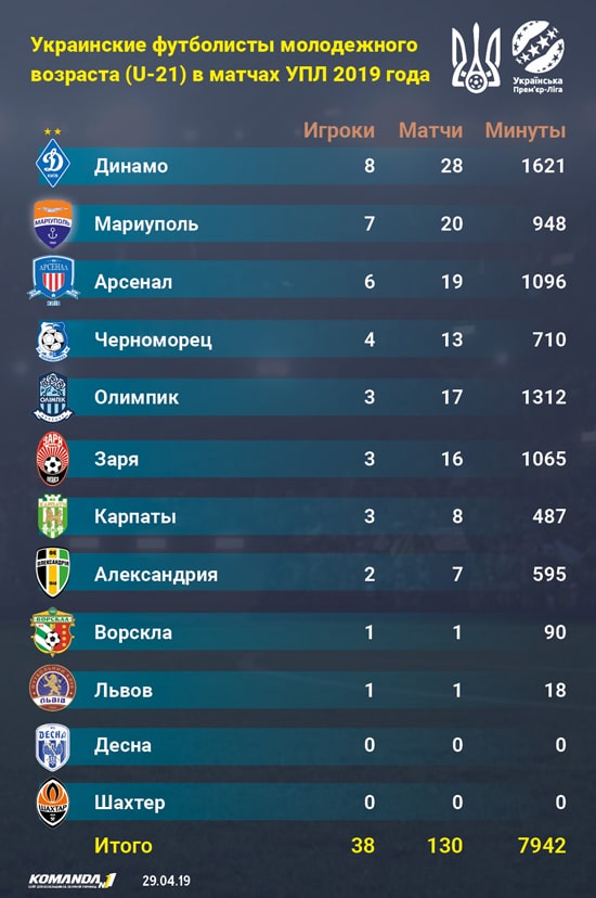 Впрочем, тут не об этом. Все говорят, и спорить с этим бессмысленно, что уровень УПЛ упал ниже плинтуса, и в этой ситуации ставка на перспективу так и просится. Другое дело, что не везде с молодыми готовы работать и ждать. Мы решили проанализировать, как на развалинах нынешней УПЛ задействуют молодых отечественных футболистов. За основу взяли ребят 1998 года рождения и младше — тех, кто подходит для нынешней молодежки, которой уже через месяц выступать на Мемориале Валерия Лобановского (его мы не выигрывали 10 лет), а в сентябре — стартовать в отборочном турнире ЧЕ-2021. Кроме того, в конце мая и, надеемся, в начале июня наша юниорская сборная сыграет на чемпионате мира в Польше, а тут с практикой в УПЛ дела обстоят еще хуже. Итак, просто факты.