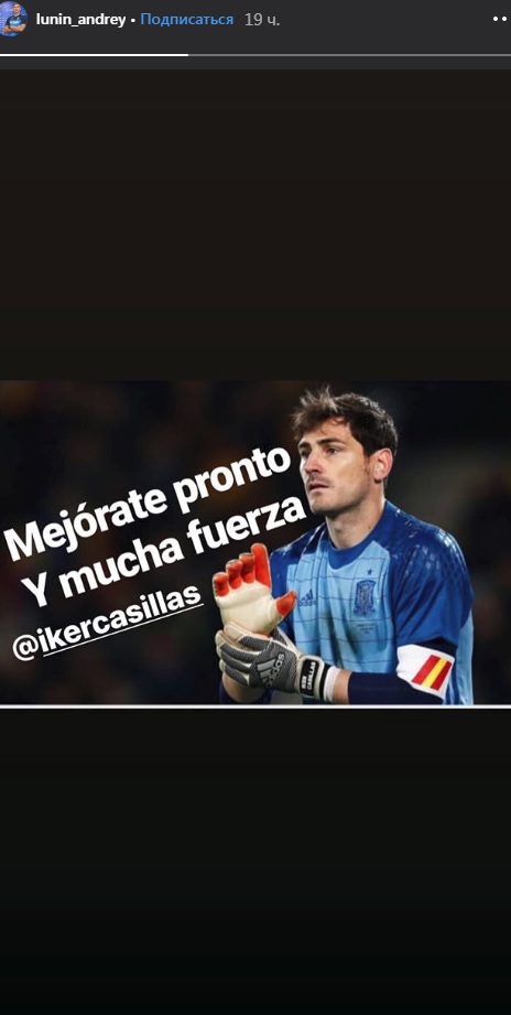 Голкипер сборной Украины Андрей Лунин поддержал испанского вратаря Икера Касильяса, у которого случился инфаркт во время тренировки "Порту".