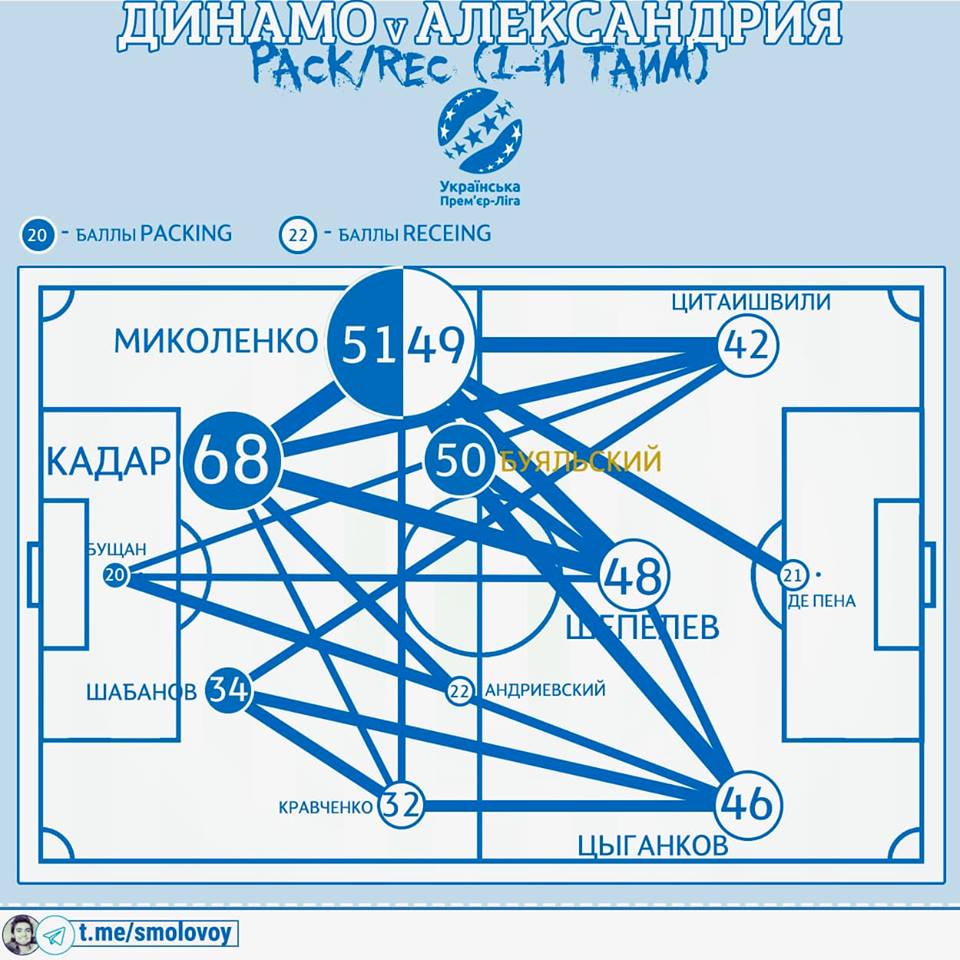Мы не разрезали пространство передачами на Де Пену: только у Миколенко есть канал, ещё 4 балла Rec накинул Кадар. Но никто из тройки хавов не отрезал соперников передачами на Карлоса. Ни один в первом тайме.