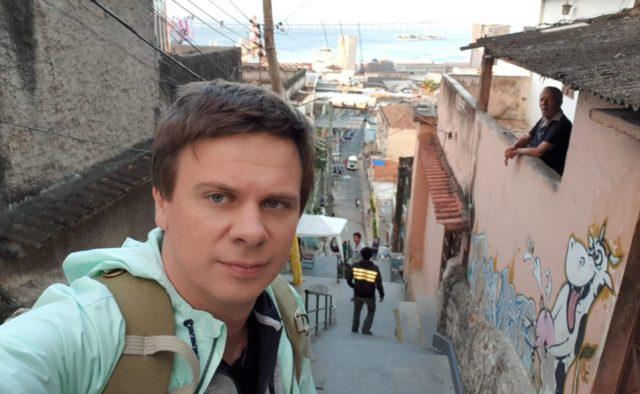 Далі – дві паралельні історії: футбольна історія, а також історія нашої адаптації до цієї жесті. Тільки-но ми зайшли, пролунали постріли. Мені здалося, що це салют. Наш гід лише усміхнувся: "Ти помиляєшся, це не салют". Прислухаюся – і справді: пістолет, автоматна черга… Замість того, щоб шукати прихисток, я лише обурився: "Йолки-палки, не дадуть нормально звук записати". За ті 200 днів у Бразилії ти настільки звикаєш до того, що стрілянина – це норма, що не звертаєш увагу на небезпеку.