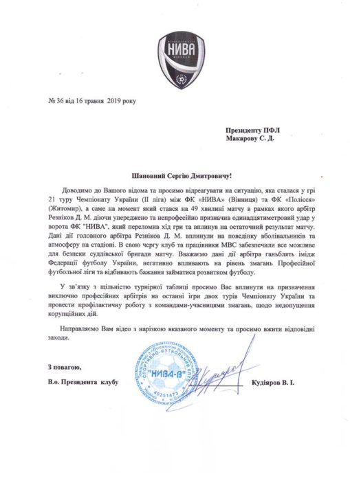 "Сьогодні направили офіційний лист на ім’я Президента Професіональної футбольної ліги Макарова Сергія Дмитровича. Чекаємо реакції!"