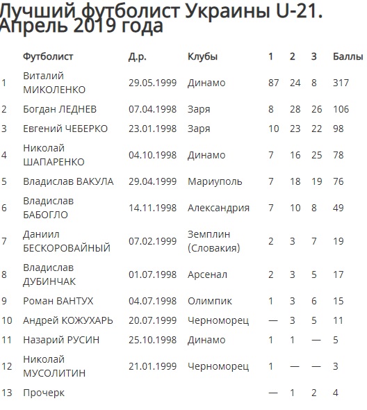 Виталий Миколенко уверенно возглавляет рейтинг футболистов Украины среди поколения 1998—1999 годов рождения. Как и в марте, в апреле он вновь занял первое место в традиционном опросе проекта Золотой Талант в категории U-21. А раньше, напомним, Миколенко признавался лучшим игроком октября и ноября, а затем — еще и 2018 года в целом, но в категории U-19.