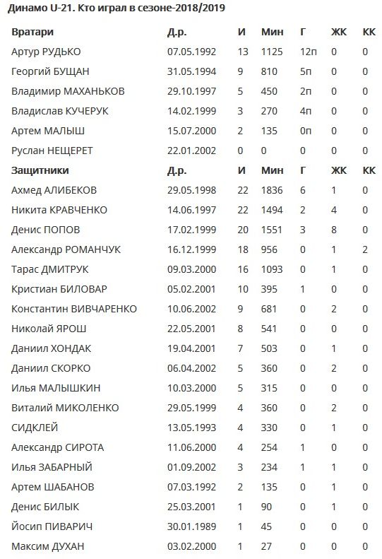 Итак, в первой команде Динамо в сезоне-2018/2019 играли такие футболисты молодежного возраста: Владимир Шепелев, Никита Кравченко, Виктор Цыганков (все — 1997 год рождения), Ахмед Алибеков, Евгений Смирный, Николай Шапаренко, Назарий Русин (все — 1998), Денис Попов, Виталий Миколенко (оба — 1999), Владислав Супряга, Евгений Исаенко и Георгий Цитаишвили (все — 2000). Плюс датчанин Миккель Дуэлунн (1997). Очень перспективная команда, но ей требуется время.