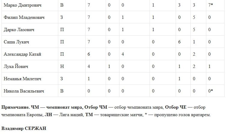 Забивали среди перечисленных ниже Белых орлов восемь игроков. Лидируют по точным ударам ветераны команды Митрович (23), Тадич (15) и Коларов (11). Отметим, что уже успел отличиться и Лука Йович, на счету которого всего четыре матча за сербскую команду. В рамках отбора на ЧЕ удавалось забить Льяичу (два гола), Коларову (один) и Тадичу (один).