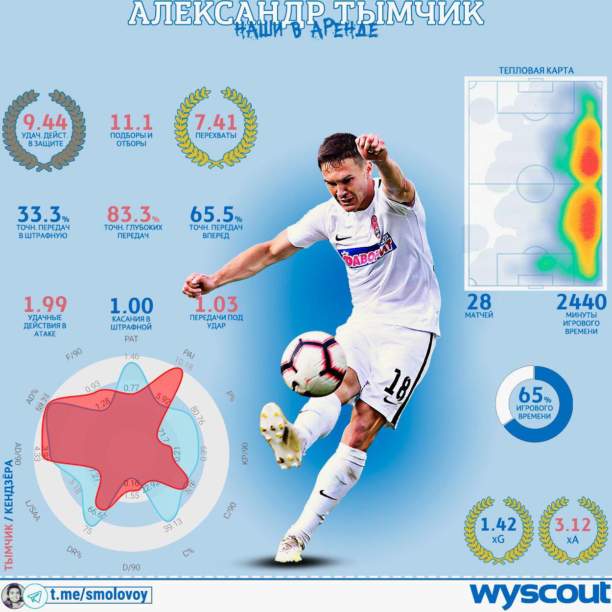 Включения Тымчика в атаку порой достаточно эффективны: Саша чаще отдаёт под удар (1.03/90 против 0.67/90) и отсюда большая общая сумма ожидаемых голевых передач (3.12 xA против 2.63 xA).
