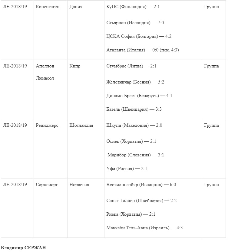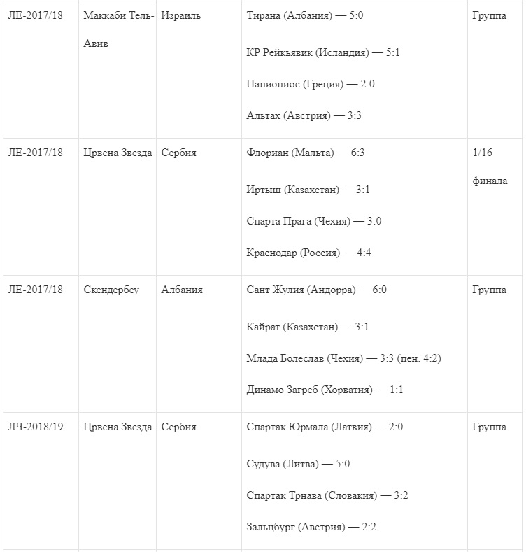 Отметим, что в 15-ти эпизодах команды проходили все стадии в Лиге Европы, и лишь Црвеной Звезде в прошлом году удалось подобное в Лиге чемпионов. В первую очередь это связано с изменение формата, ведь ранее в первых раундах выступали исключительно «карлики». В итоге белградцы в раунде плей-офф по правилу гостевого гола прошли Зальцбург и добились дебюта в группе ЛЧ.