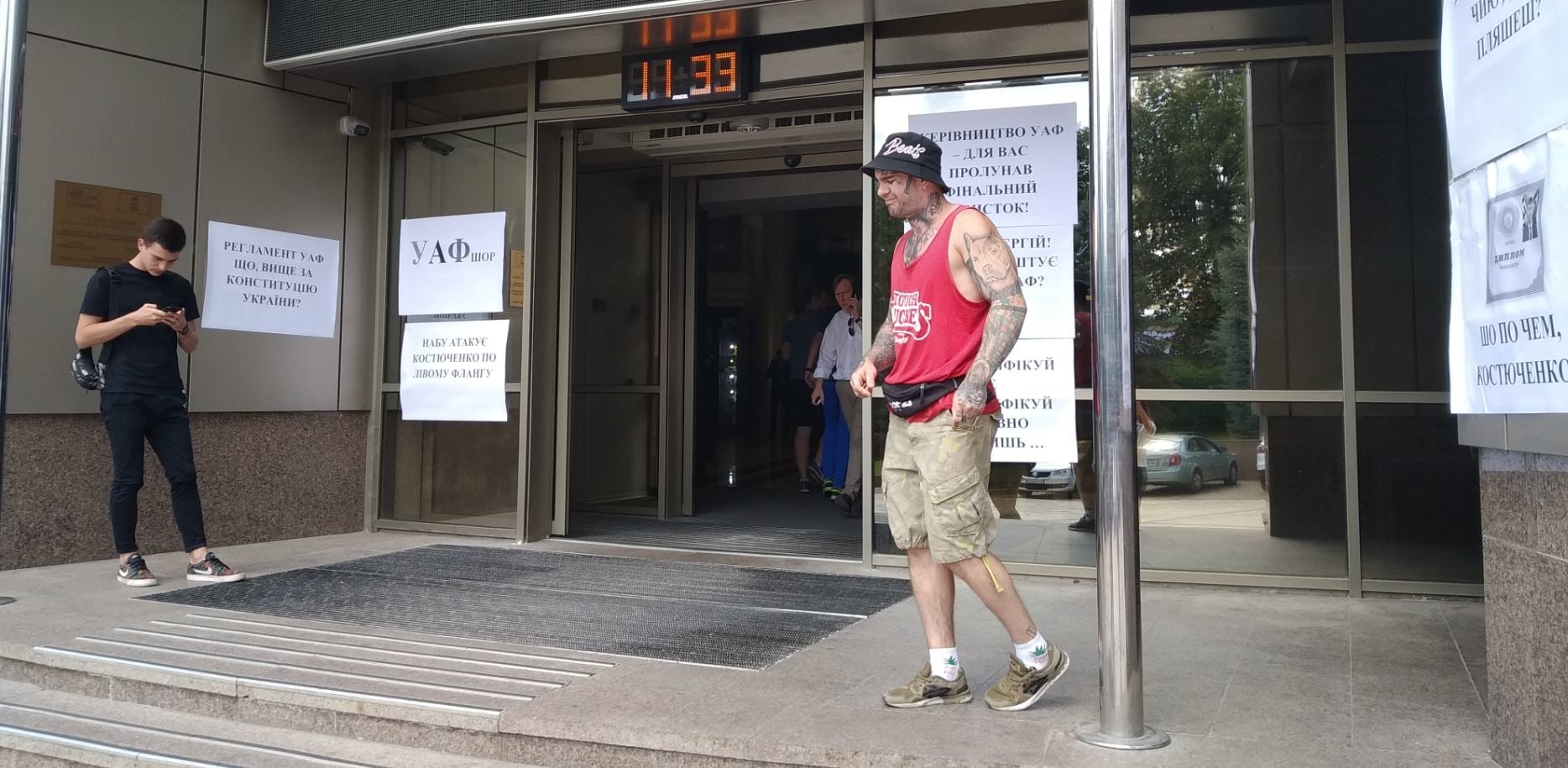 Фанаты обклеили здание плакатами с текстом «Дожджанюк під чию дудку пляшеш?», «Шо по чем Костюченко?», «Регламент УАФ що, вище за Конституцію України?», «УАФшор», «НАБУ атакує Костюченко по лівому флангу», «Керівництво УАФ – для вас пролунав фінальний свисток», «Задіран Сергій, скільки коштує атестат УАФ», «Десквалифікуй не дискваліфікуй всеравно получишь...».