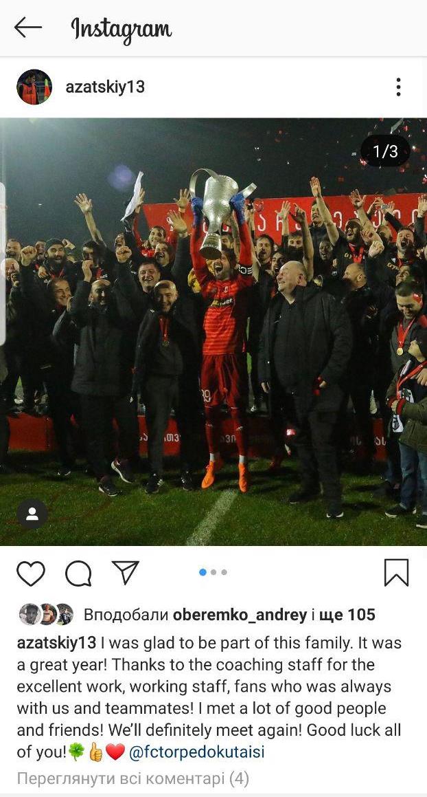Бывший защитник "Динамо" Александр Азацкий покинул грузинский клуб "Торпедо" (Кутаиси). Об этом сообщил сам футболист на своей странице в Инстаграме, поблагодарив клуб, тренерский штаб, персонал и болельщиков за все.