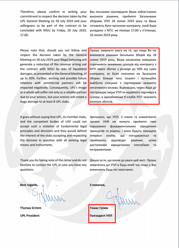 В обращении также выражается просьба выполнить решение большинства клубов УПЛ о передаче телеправ телеканалам «Футбол 1/2».