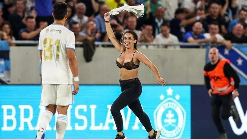 Во время матча "Слован" - ПАОК на поле выбежала девушка без футболки