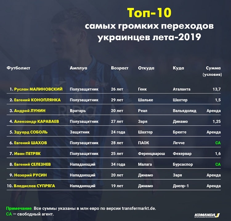 Малиновский, Коноплянка, Лунин и еще семь самых громких трансферов украинцев лета-2019