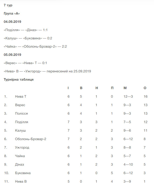 А завершував 7-й тур поєдинок у Млинові, де «Верес» приймав тернопільську «Ниву». До речі, у серпні ці команди вже зустрічалися в першому попередньому раунді Кубку України, і тоді в компенсований час перемогу вирвали рівняни. «Ниві» вдалося взяти реванш, хоча територіальною перевагою довго володів «Верес». Утім, до небезпечних моментів у воріт гостей справа не доходила. А на 73-й хвилині господарі залишилися в меншості після вилучення з поля їхнього голкіпера Максима Бабійчука. Його замінив Ігор Фіяло, який двічі рятував свою команду від неприємностей. Проте на 88-й хвилині й він не допоміг після удару Сергія Кисленка з-за меж штрафного майданчика. 0:1. «Верес» зазнає першої поразки, а «Нива» стає одноосібним лідером.