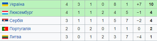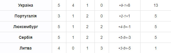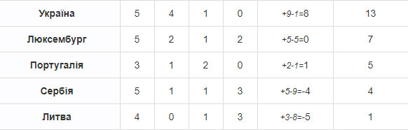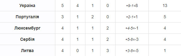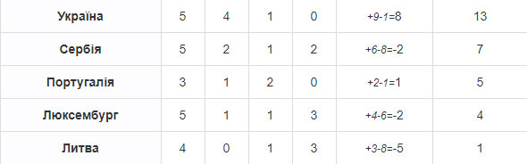 Нагадаємо, що наразі Україна лідирує у групі, маючи 10 очок після чотирьох ігор. В активі Люксембургу та Сербії по 4 бали, але у балканців зіграно на одну зустріч менше. Португалія набрала 2 пункти у двох поєдинках, а Литва – 1 у трьох.