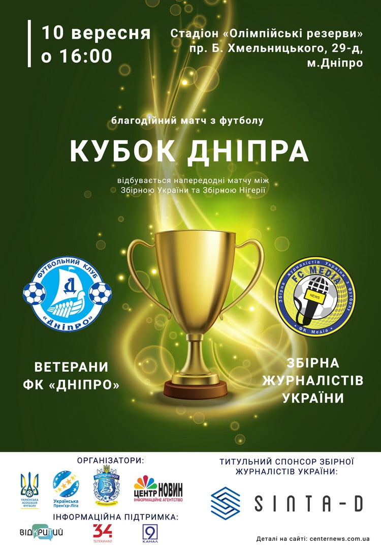 10 вересня о 16.00 у Дніпрі на стадіоні «Олімпійські резерви» розпочнеться матч за Кубок Дніпра між збірною ветеранів ФК «Дніпро» та збірною журналістів України.