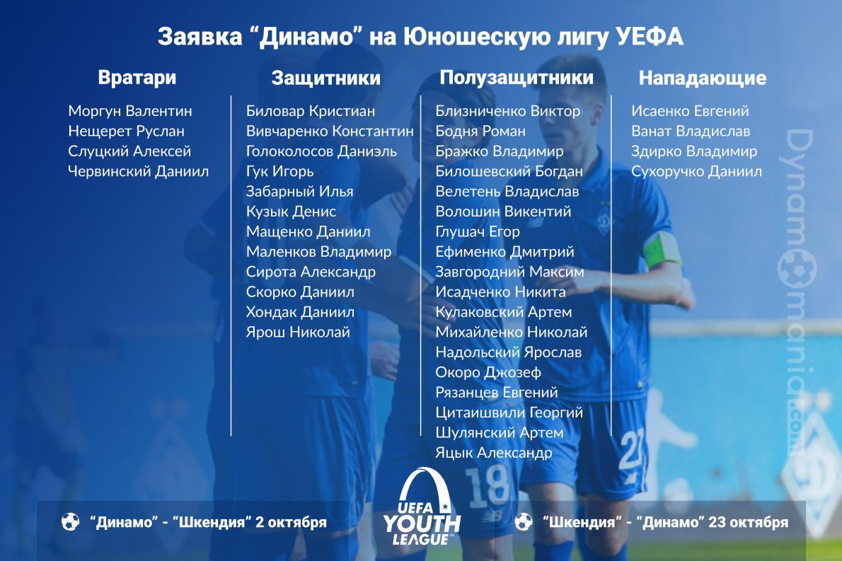 Стал известен заявочный список "Динамо" для участия в Юношеской лиги УЕФА сезона 2019/20. Он состоит из 38-ми футболистов, в том числе в нем присутствует пять игроков 2000 года рождения, которых по регламенту можно включать в заявку (базовый год рождения в этом сезоне - 2001).
