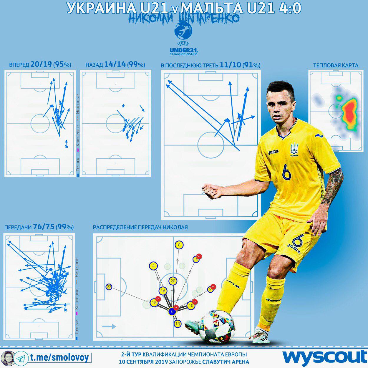 Блогер Михаил Смоловой в своем Telegram-канале разбирает игру полузащитника "Динамо" Николая Шапаренко за сборную Украины U-21 против мальтийцев.