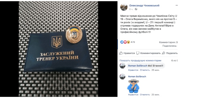- Маючи пряме відношення до Чемпіона Світу U - 19 – Олега Веремієнка, якого вів на протязі 5 – ти років ( в академії, U – 21 і першій команді ) отримав подарунок на День Ангела!!! Вірю в Олега, він має велике майбутнє в професійному футболі.