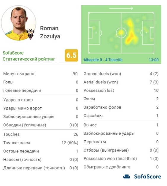 Роман Зозуля провалив поєдинок, як і решта його партнерів. Українець жодного разу не пробив по воротах та продемонстрував лише 60% точності передач.