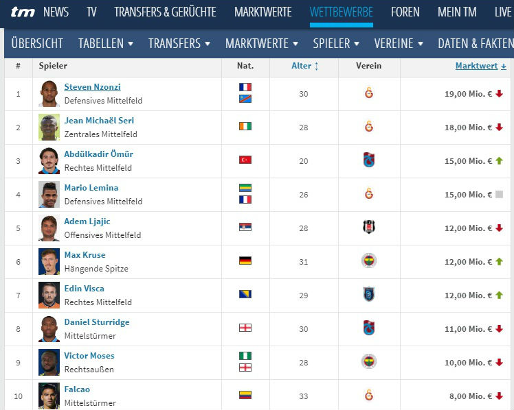 Самым же дорогим футболистом тамошней лиги transfermarkt.de считает французского хавбека Галатасарая Стивена Нзонзи (19 млн евро).