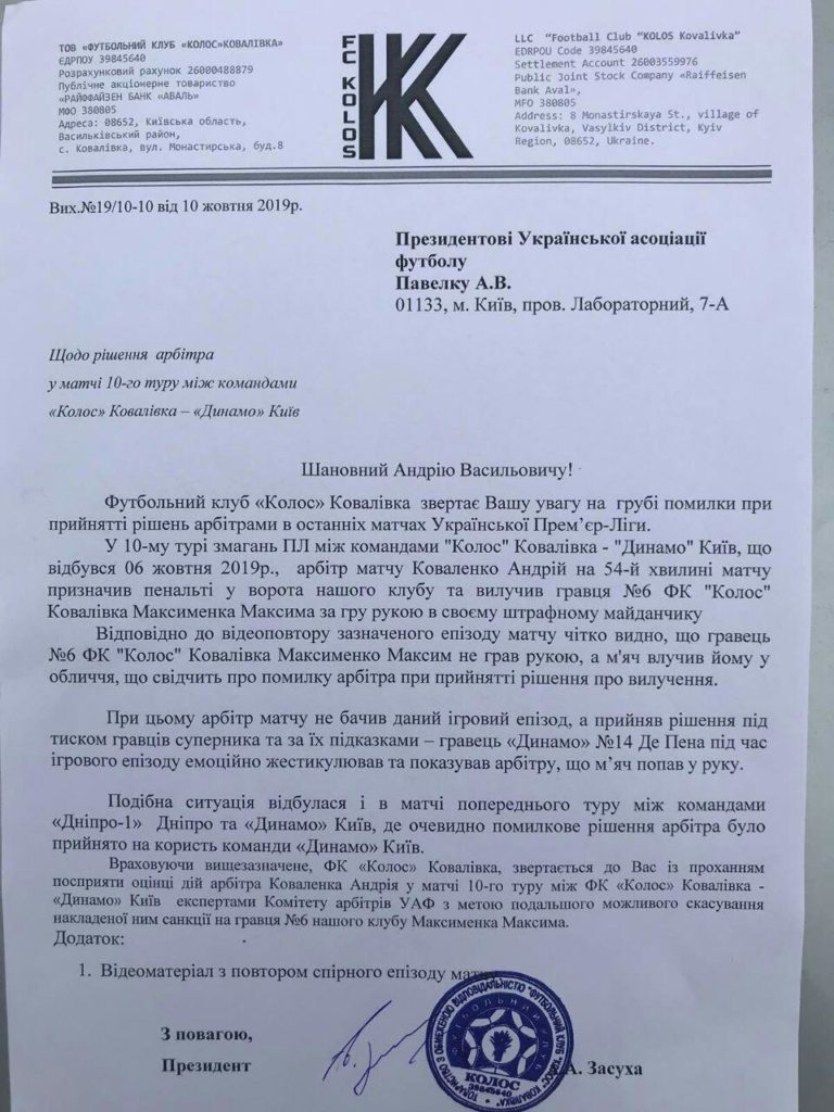 «Колос» направил в Украинскую ассоциацию футбола письмо с просьбой посодействовать оценке действия арбитра матча 10-го тура УПЛ с «Динамо» (0:4) Андрея Коваленко с целью возможной отмены наказания защитника Максима Максименко.
