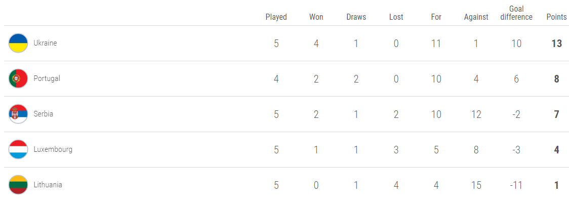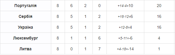 Примітка. У таблиці прописані уявні перемоги/поразки з рахунком 1:0, а також "перемогу" Сербії над Україною 6:0.