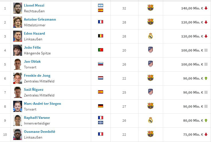Топ-10 самых дорогих футболистов Ла Лиги прямо сейчас