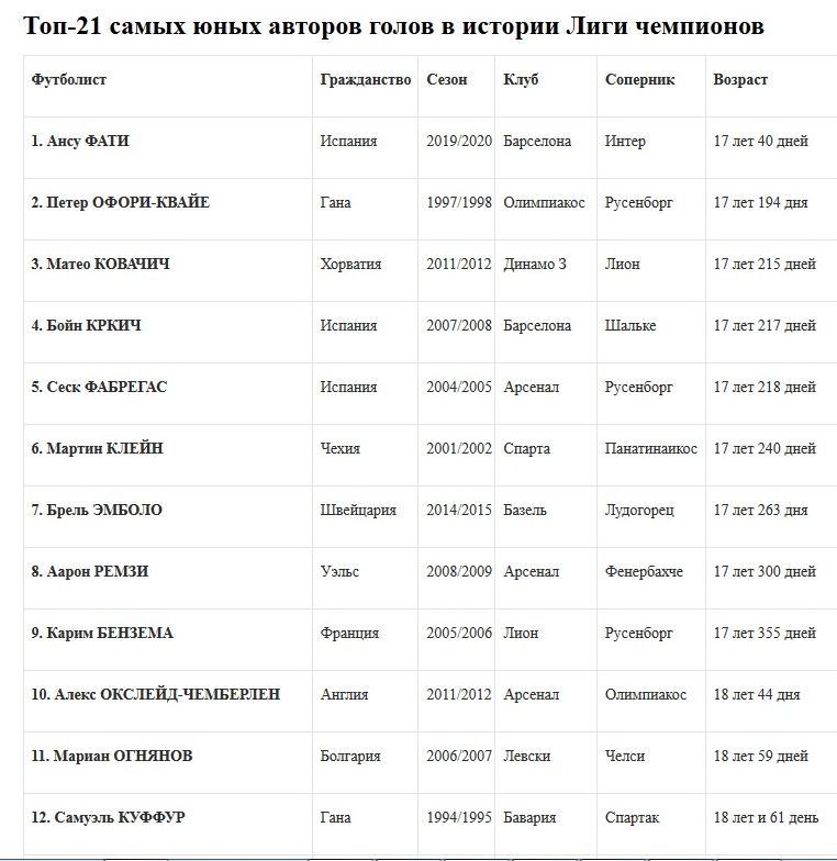 10 декабря в Милане на 86-й минуте матча заключительного тура группового раунда Лиги чемпионов-2019/2020 Интер — Барселона (1:2) случилось исторической события. Нападающий гостей Ансу Фати забил победный мяч и стал самым молодым автором гола в истории Лиги чемпионов. В этот момент юнцу было 17 лет и 40 дней.