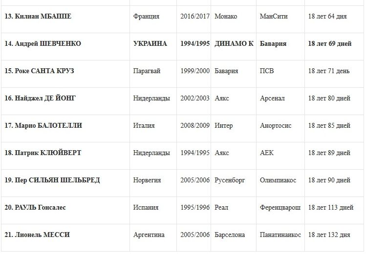 В рейтинге самых юных авторов голов в истории Лиги чемпионов Андрей Шевченко занимает 14 место, пишет zbirna.com.