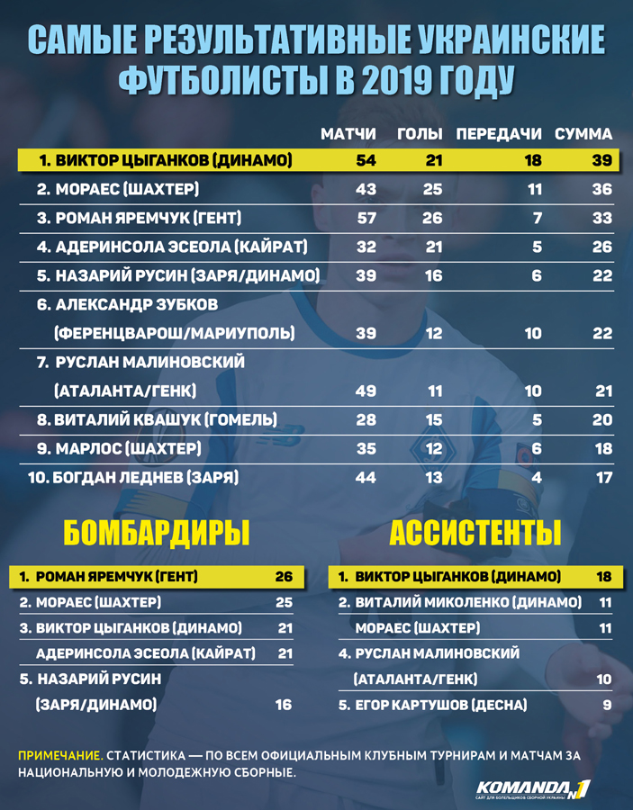 Самым результативным украинским футболистом 2019 года стал полузащитник Динамо и сборной Украины Виктор Цыганков, который за этот период набрал 39 очков по системе гол + пас. В сумме во всех официальных клубных турнирах, а также за сборную Украины он провел 54 матча (пропустил только две игры за клуб и одну — за национальную команду). В активе вице-капитана Динамо 21 забитый мяч и 18 голевых передач (статистика — transfermarkt).