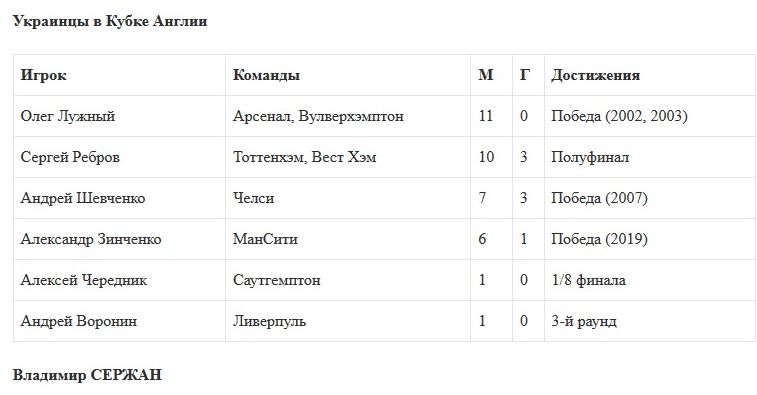 Среди всех наших легионеров на Альбионе шестеро участвовали в Кубке Англии. Трое из них выигрывали титул — помимо Зинченко это делали Олег Лужный с Арсеналом (дважды) и Андрей Шевченко с Челси. В 2003-м Лужный провел все 90 минут в финале с Саутгемптоном (1:0). Для Сергея Реброва лучшим результатом оказался полуфинал в составе Тоттенхэма.