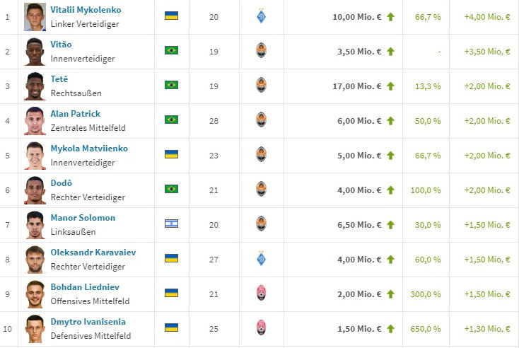 Сегодня zbirna.com глянет на тех, кто рекордно для нашего чемпионата прибавил в цене. Приятно, что в топ-10 этого рейтинга нашлось место сразу пяти украинцам. А результаты Виталия Миколенко и Дмитрия Иванисени — очень впечатляют!