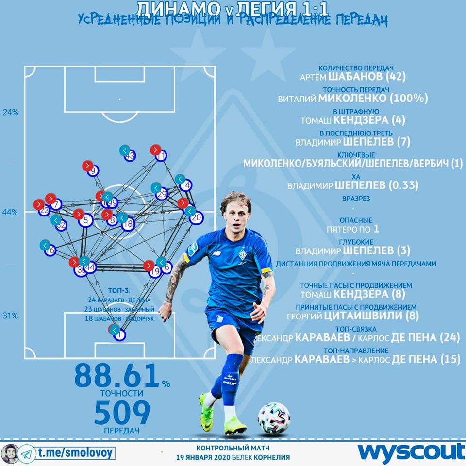 Складываем пазл. В первом тайме Легия закрыла Шабанову возможность продвигать мяч. Высокий блок польской команды долго удерживал нас на границе первой и второй зон. Отсюда большее количество передач за владение, чтобы блок разбить. И будь поставлена задача делать это длинными передачами - разбивали бы этим способом. Но акцент похоже поставили потренироваться обходиться без «бей вперёд». Доля длинных передач - низкая (менее 10%). О 22% речь не идёт, как у нас бывало с Зарёй...