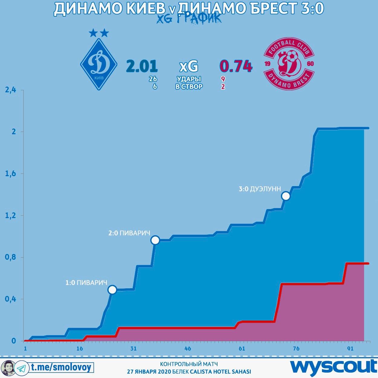 Брест нанёс 9 ударов (2 попадания в створ). С 26’ по 59’ минуту Киев не позволил сопернику ни одного удара. А всего за первый тайм - только 3 попытки.