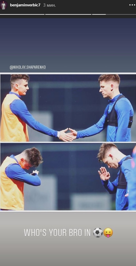 Полузащитник "Динамо" Беньямин Вербич поделился забавной фотографией с Николаем Шапаренко с тренировки команды.