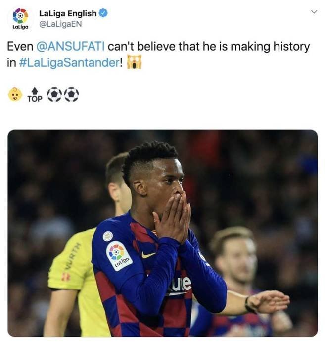 «Даже Ансу Фати не верит, что он сотворил историю», - подписали фото (на котором был Семеду, а не Фати) в твиттере Ла Лиги.
