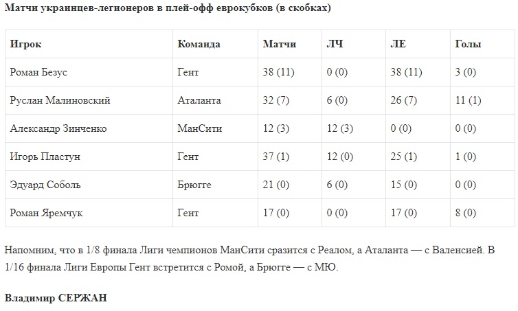 Украину в еврокубковой весне представит не только Шахтер, но и несколько сборников, выступающих за рубежом. Так, на Лигу чемпионов заявлены два наших легионера, а на Лигу Европы — четыре. Мы решили выяснить, кто из них имеет наибольший опыт выступлений в плей-офф, пишет zbirna.com.